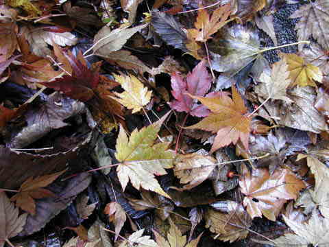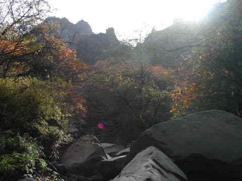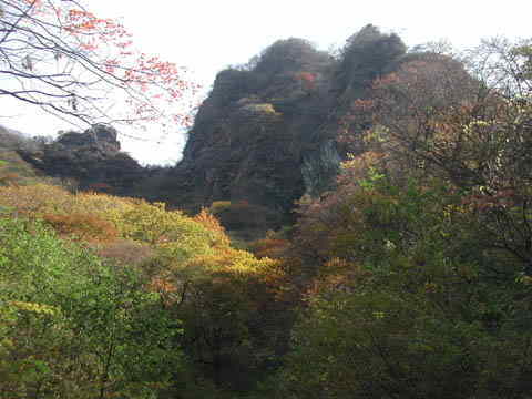 垂直の岩壁に挟まれた空間に紅葉の木々が輝いていた。 |