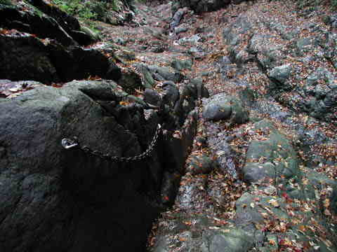 滑りやすい河床を鎖につかまって降りる。 |