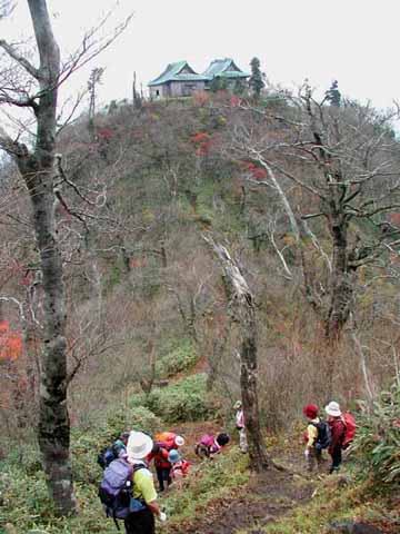山歩くらぶの例会には珍しく、小雨交じりの曇天模様。 写真は南岳から見た中岳ですが、紅葉はすでに終わっていました。 正面登山道の900mあたりの色づきが良かったようです。 今日は豊前坊で、山伏の峰入行事「護摩焚き」が行われていて、山伏装束の修験者や信者や登山者で、お山は大賑わいでした。 |