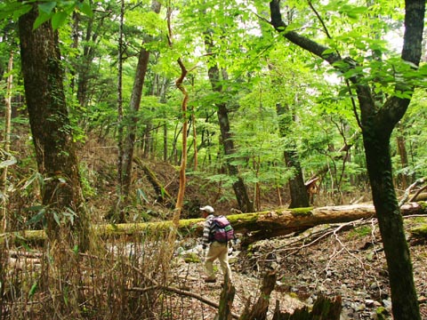 山頂から少し戻って8:30権七小屋谷分岐の広場に着く。笹を分けて入った谷は急傾斜で岩石と倒木が谷を埋めている。落石があるため50mほどの距離を取って慎重に下る。