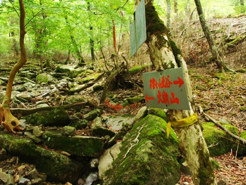 | 12:22 稜線への急登を終え、笹薮を少し漕ぐと大崩山頂下の登山道に飛び出た |