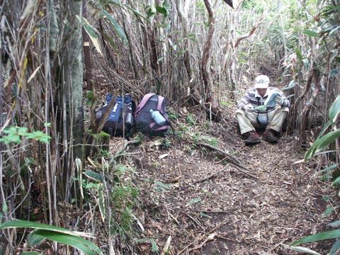 昨晩は宇土内谷登山口でテント泊。シュラフを忘れたため、雨着を着込み、シュラフカバーとツエルトに包まって寝る。朝、簡単に食事をしてテントを撤収して5:30に登山口を出発する。