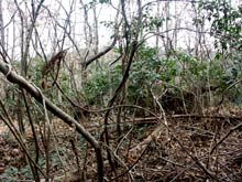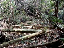 | すり鉢の底のような広場(D点) | E点から正面の林道に入る | 林道は風倒木でつぶされている |