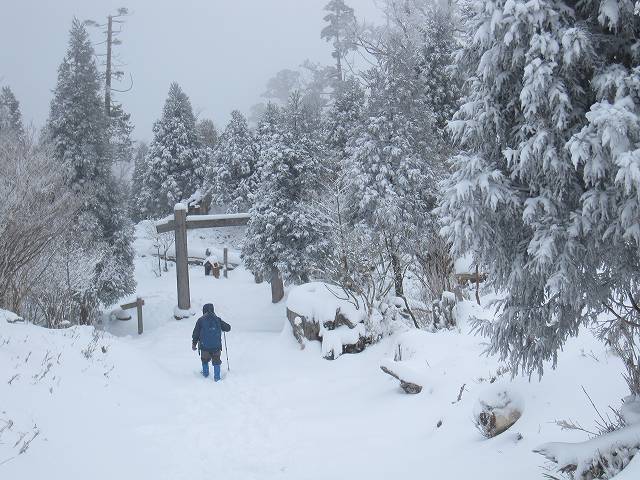 | 雪の奉幣殿にて、登山の安全祈願 |