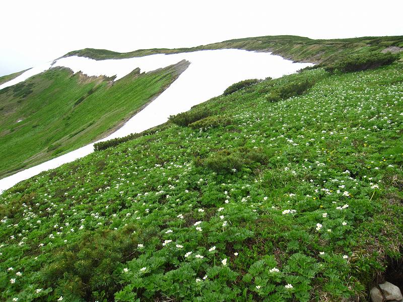 | 黒部五郎岳を目前にする、山頂部は激しくガスが流れている |