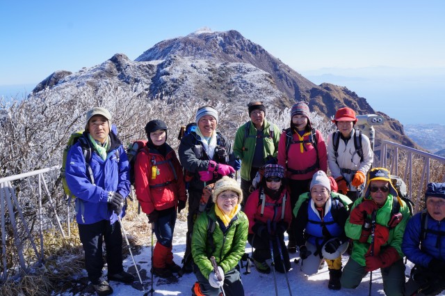 青空と霧氷の雲仙普賢岳。2月に入ってどんよりとした曇り日が多かったのですが、この日は絶好の晴天。仁田峠は強風で強烈に寒かったが、山中はそれほどでもなく、素晴らしい山行でした。