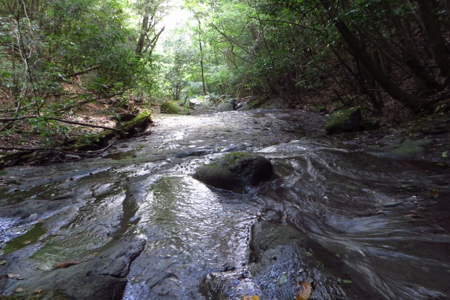 全体的には予想していたよりも倒木やブッシュは少なくて助かりました。 下りに使った沢の最後の200mほどの区間はナメの河床が美しく倒木も少なく水遊びに最適な場所でした。 ここから2kmほど下った地点に轟集落があり北側からの彦水川を合わせて轟川となります。 轟川は更に山国川となって中津で周防灘に流れ込みます。 山国川は総延長56kmの一級河川です。 ++++++++++++++++++++++++++++++++++++++++++++++++++++++++