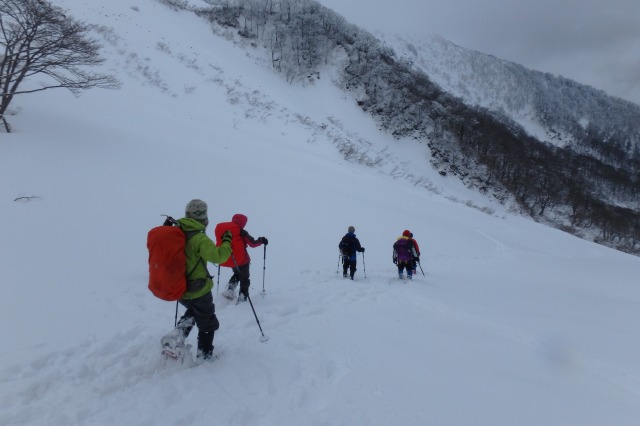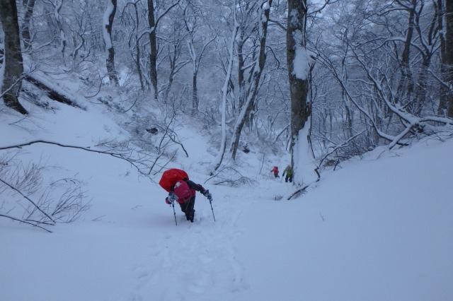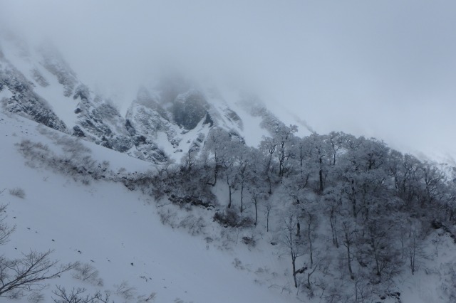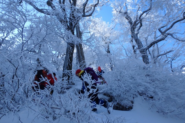 ![]() 駐車場にて準備をして朝6時に出発する。 別山バットレス登攀班4名は既に5時に出発している。 ![]() 大神山神社の石段を登る。確かに雪が少ない。 ![]() 安全登山を祈願する ![]() 下宝珠越分岐の標識 ![]() この地点から踏み跡は無くなった ![]() 上部に上がるにつれて斜度が増す ![]() 尾根に登り上がる。下宝珠越より手前に上がったようだ。 ![]() 尾根の霧氷林が綺麗だ。がんばって登り上がった後だけによけいに美しく感じる。 ![]() 全員が揃うのを待って出発する ![]() ここが下宝珠越 ![]() ![]() 雪の結晶みたいな細い針状のものが成長している ![]() ![]() ブッシュの尾根を行く ![]() このあたりが中宝珠越なのだろう ![]() ![]() 前方に山の姿が見える。空が少し開けてきた。 ![]() まもなく青空が見えてくる ![]() 霧氷か着雪かわからないが青空バックに綺麗だ ![]() 突然枝越しに大山主稜線が現れる。 別働隊が登攀中の別山バットレスが正面に望める。 目を見開いて人影を探すが残念ながら確認できない。 無線で交信する。 ![]() このキラキラ感は写真では表現が難しいが本当に綺麗だった。 ![]() 我々が目指す天狗ヶ峰方面 ![]() 絶景に心奪われる ![]() 弥山尾根と別山尾根 ![]() 素晴らしい青空が広がった ![]() 海が見える! これまで大山には数回以上は来ているが、山から海を臨めたのは今回が初めてだ。 大感激! ![]() 青空と太陽光で霧氷が一段と輝く ![]() 何度も眺めて写真を撮る ![]() 左が弥山尾根、右が別山尾根 ![]() 大山北壁下部 ![]() ![]() ![]() ![]() 上宝珠越へ ![]() 左端にユートピア小屋が見えてきた。 ![]() ユートピアから天狗ヶ峰に連なる尾根。 ![]() 無線で交信は出来るが、我々の方からも向こうの方からも、目視確認は出来なかった。 ![]() ![]() 屹立する大屏風岩、中央。 ![]() ![]() 上宝珠越へ ![]() ![]() 上宝珠越へ ![]() ![]() 尾根上にユートピア避難小屋が見える。 前方の樹林の切れたあたりが上宝珠越であろうか。 ![]() ![]() ![]() 上宝珠越にようやく到着する ![]() 新雪のラッセルに時間を要してここまで5時間経過したため、 残念ながら天狗ヶ峰登頂は断念してここで引き返すことにする。 ![]() 上宝珠越で食事をして少し戻った地点の谷筋から元谷に向けて一気に下る。 シリセードで下ったが最初の地点は斜度があり下が凍っていた為、ブレーキが利かずかなり怖かった。写真の地点になると逆に抵抗が大きすぎてあまり滑らない状態。 ![]() 左から下ってきている谷が元谷本谷であろう ![]() ![]() ![]() ![]() ここでワカンに履き替える ![]() 元谷を下る ![]() 下る途中で滑落停止訓練をする ![]() 迫力ある大屏風岩 ![]() ![]() ![]() 無事下山 ![]() 定宿の緑荘にて。 別山バットレス登攀班は予定通り登攀完了してほとんど同時刻に到着。 夕食前に軽く反省会。 ![]() 夕食はカニ鍋 ![]() 日本海に沈む夕陽 ![]() 翌日は松江城を見学して久留米到着は17時でした。 私の好きな九州の山 |