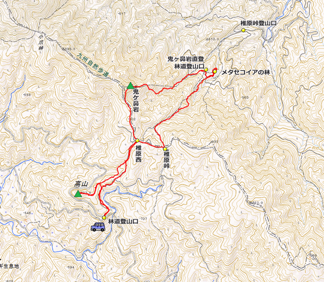 ![]() 来年の2月末まで工事予定 ![]() 舗装道を敬遠して隣の尾根に入る。 地図を見ると「高山」という三角点のあるピークを発見して寄り道。 ![]() 綺麗な紅葉が未だ残っていました ![]() 色違い ![]() 椎原峠西。 舗装工事が完了すればここまで車で進入可能? ![]() 椎原峠から下ります ![]() お目当てのメタセコイアの林 ![]() 林道横断 ![]() この3本が一番形が揃っていました。 青空バックで決まり! ![]() メタセコイア林の黄葉 ![]() メタセコイア林の黄葉 ![]() 明るめに ![]() 逆光で生き生き ![]() ![]() メタセコイアの若木 ![]() この個体は赤みが強い ![]() 山を背景にして 南国ムード? ![]() 落葉が進んでいるのか、隙間が多い。 ![]() 順光で色彩がはっきり ![]() ![]() たっぷり時間を取って写真タイム終了 ![]() 日当たりの良い林道で食事後 鬼ヶ鼻岩直登コースを上ります。 ![]() 林道登山口 ![]() しばらく沢沿いに上ります ![]() 沢を離れて尾根に急登 ![]() 登り上がった尾根 更に急登が続く ![]() 鬼ヶ鼻岩直下の岩場の登り ![]() 到着 ![]() 中央にメタセコイアの林 ![]() 脊振山頂 ![]() 鬼ヶ鼻岩直登コース ![]() 西山 ![]() 油山 ![]() 下山時、縦走路の紅葉 ![]() もう紅葉は終了と思っていたのに 思いがけないプレゼント ![]() 私の好きな九州の山 |