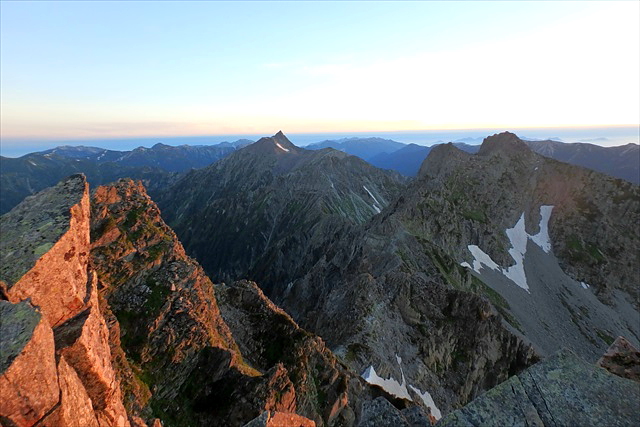 山頂で日の出を待つ。雲間から太陽が顔をのぞかせる。岩が赤く染まってゆく。神々しい光景の中、息を止めてシャターを切る。槍穂を中心に四周の山々が目覚めの時。一時間ほど涸沢岳山頂で夜明けの風景を楽しむ。