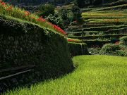 あぜを真っ赤に彩る彼岸花と黄金色の稲穂との絶妙なコントラストが美しい。