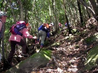 写真048 ・・林道出合より陣尾の区間は 岩場が連続します。 余裕で岩場を通過している一行です。