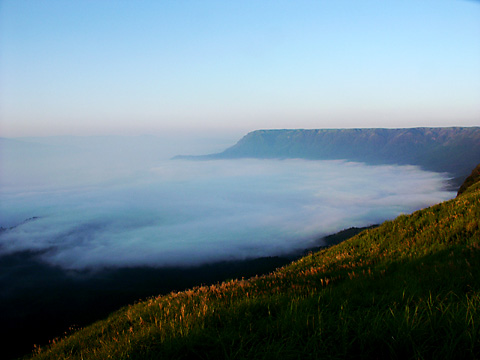 朝一番の低い光がカルデラに射してきた。阿蘇町内牧地区を覆う雲海。