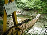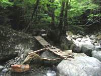 6:09/最初の吊橋は渡らずに下を潜ってゆく 6:15/次の橋を渡る 6:25/いったん黒金尾根の対岸に渡って先から戻る