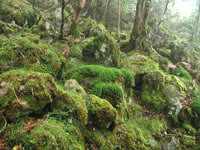 8:23/登山道で見つけた羽根。どんな鳥だろうか?(長崎のケンさんからカケスの羽では、と教えていただきました) 8:34/ここの栂(ツガ)の原生林は凄い祖母の森写真集 9:11