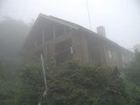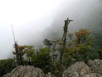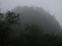 10:45/稜線近し、霧に浮かんだ展望台 10:50/峠に着いた 10:55/展望台は霧の中、ときおり霧が晴れると正面に天狗岩が圧倒的な迫力で迫ってくる