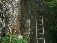 16:09/橋を渡ると登山口はすぐ。 16:17/尾平より振り返り見る祖母連山。岩峰が印象的だ。