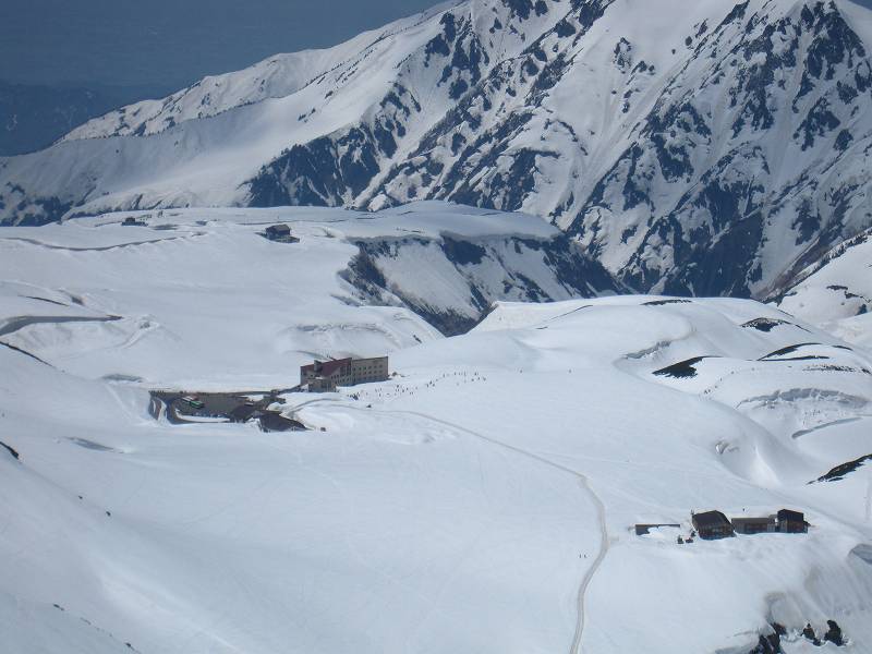 | 室堂俯瞰。中央、室堂駅。左側にバスの通る雪壁が続いている。右、室堂山荘。 |