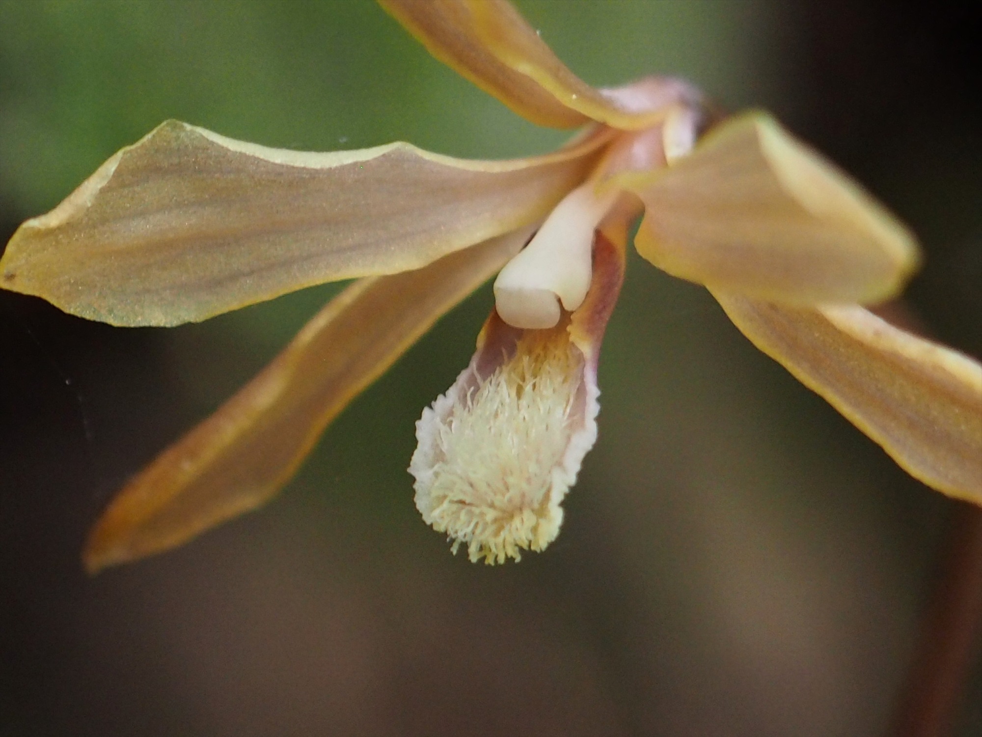 唇弁は白色〜薄紫色、へら形で中裂片には黄色の毛が密生する