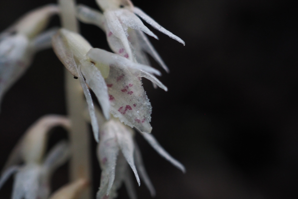 紅紫色の斑点のあるゼラチン質の唇弁と先が丸くて透明っぽい筒状の距は確認できる